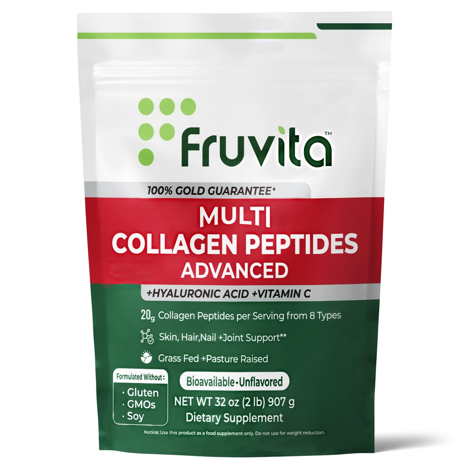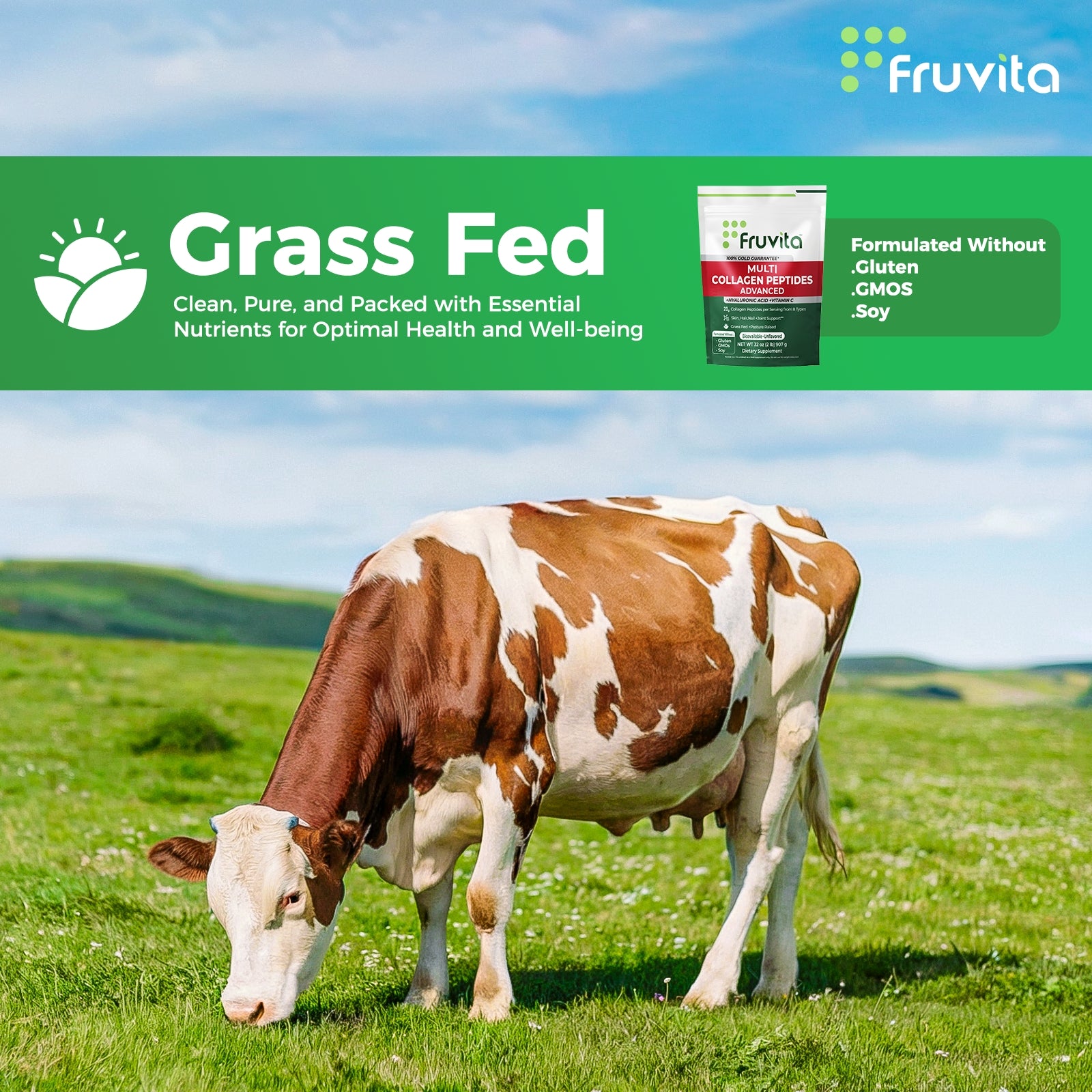 Fruvita Multi Collagen Protein Powder is made from grass-fed, pasture-raised bovine collagen, ensuring top-notch quality and purity. We prioritize clean, non-GMO ingredients that are free from gluten, dairy, and artificial additives.