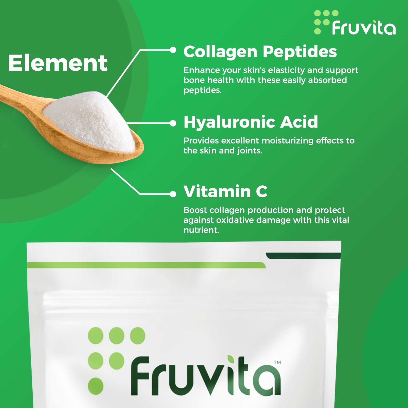 With 20g of collagen peptides per serving, plus added Vitamin C and Hyaluronic Acid, Fruvita supports healthy skin, joints, hair, nails, and overall wellness. Our formula is designed to provide maximum benefits in one convenient product.