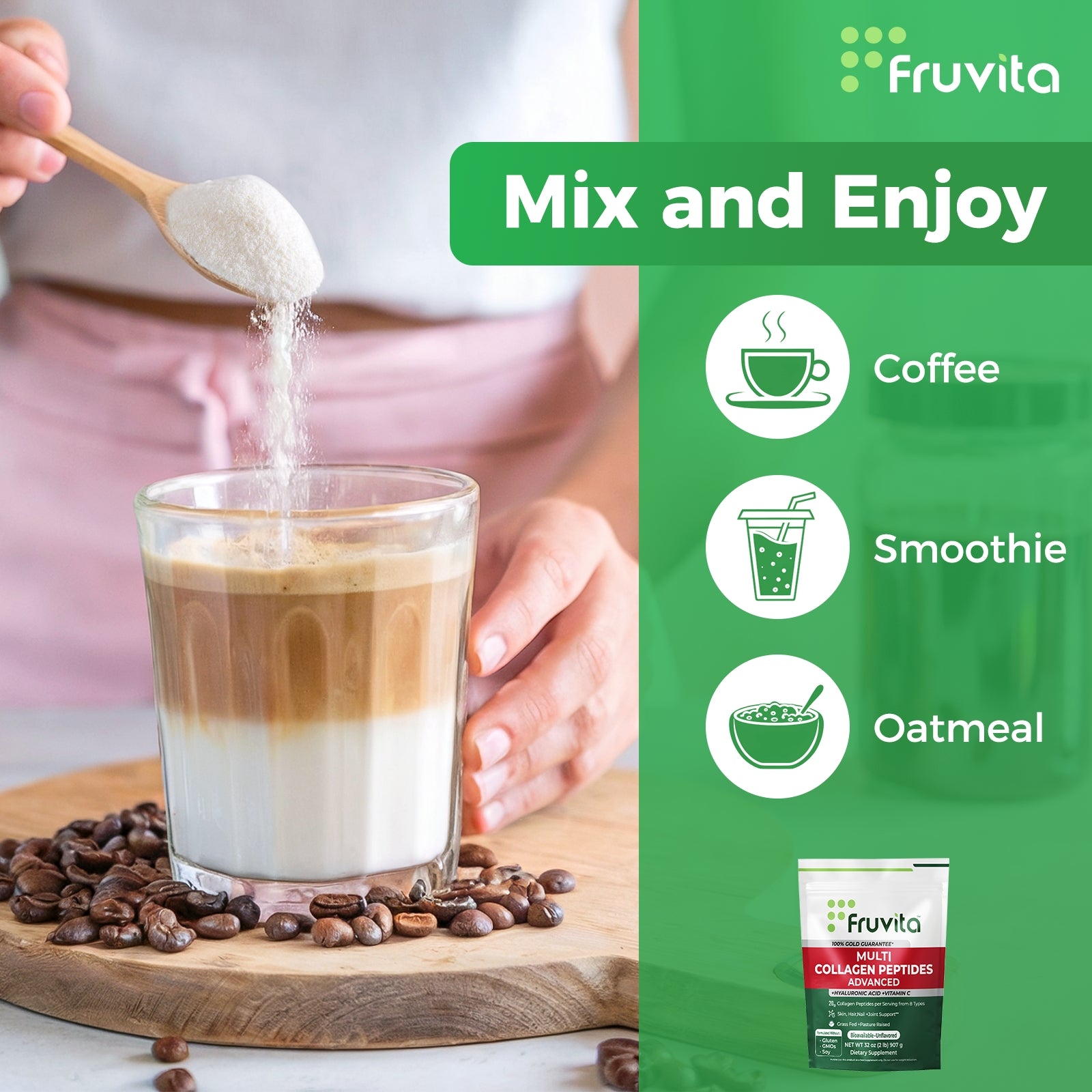 Fruvita is unflavored and dissolves effortlessly in both hot and cold liquids. It can be mixed into your coffee, tea, smoothies, or even water, making it a simple addition to your daily routine.